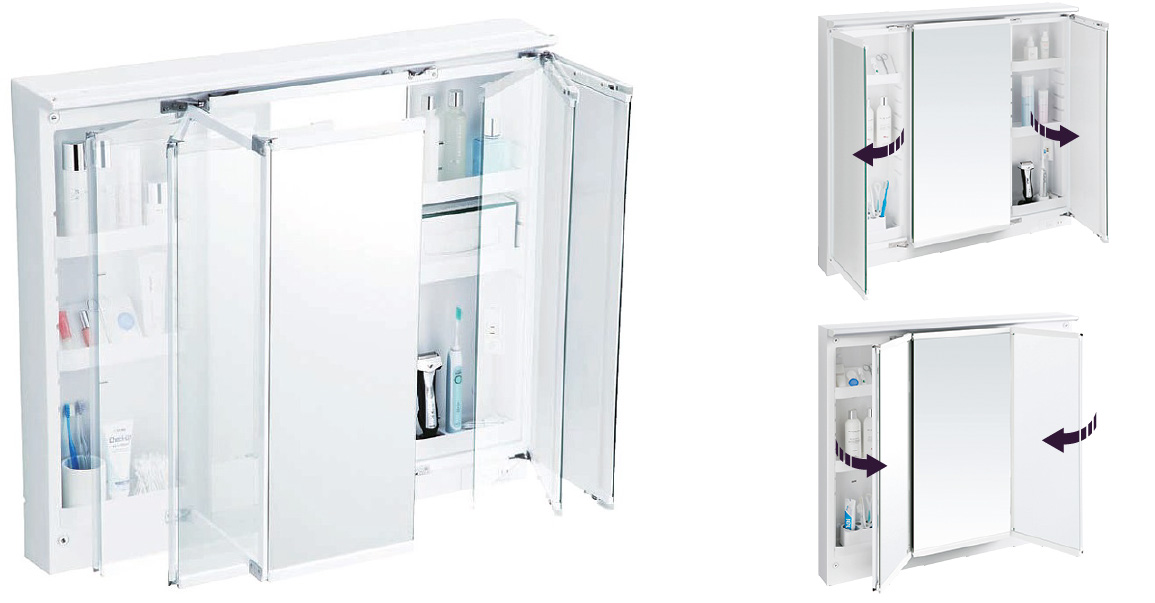 開閉できる両開きの鏡扉。スウィング三面鏡