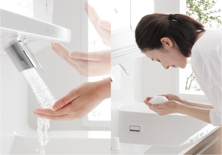 手を差し出すだけで、水がスムーズに使える自動水栓。自動きれい除菌水は排水口のキレイを保ち、お掃除もラクにします。