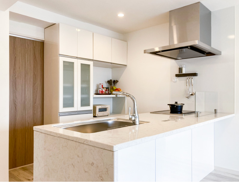 天然水晶特有の奥行き感と手触り、光沢が魅力のフィオレストーンをふんだんに使用。エンドパネルにも使用することで、空間に品格を与えます。