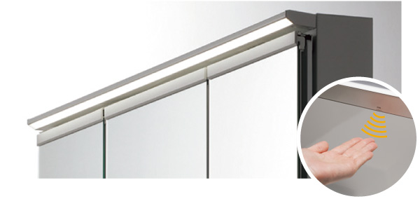 センサーに手をかざすだけで照明のオン・オフができます。鏡の間口いっぱいのLED照明が広い範囲を均一に照らします。