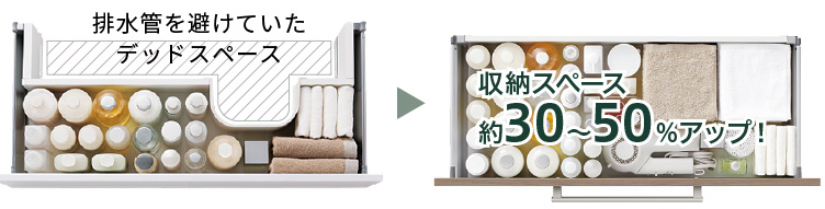 今までムダなスペースの原因となっていた排水管の配置や構造を見直すなどの工夫によって、広い収納スペースが生まれました。