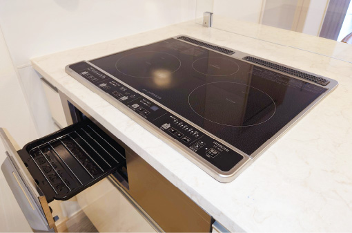 燃焼が無いので、燃焼音や気になるニオイがありません。IHクッキングヒーターは水蒸気等が少ないためキッチンを汚しにくく、フラットなトッププレートは調理しながらのお掃除も可能です。