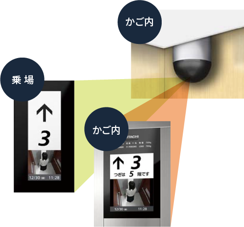 かご内に防犯カメラを設け、犯罪やいたずらを防止。映像はかご内と乗場に表示されるため、犯罪抑止効果を高めます。